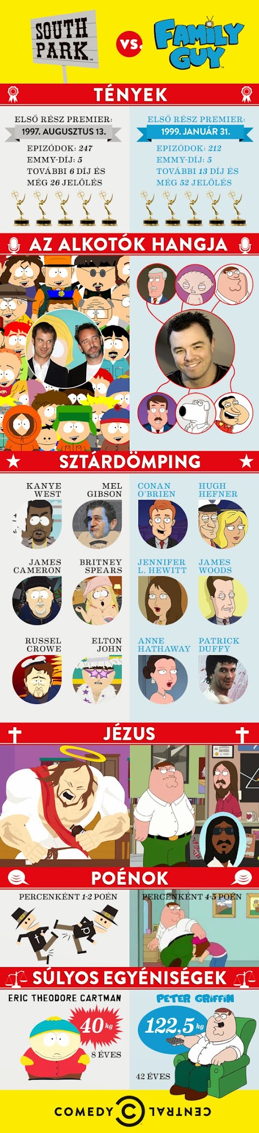 A politikailag inkorrekt poénok garmadáját elnézve nehéz dönteni a két kultsorozat között. Family Guy vagy South Park? Melyik üt nagyobbat, az iszákos, beszélő kutya és az okoskodó csecsemő, vagy Colorado kisiskolásainak kéretlen és kegyetlen beszólásai? A két emblematikus sorozat hatalmas rajongótáborral bír, a szériákat idehaza is fanatikus közönség követi a Comedy Central műsorán. Mégis melyik a jelentősebb, keményebb, betegebb? Seth MacFarlane vagy a Parker-Stone kettős agya az elborultabb? A magyar humorcsatorna a lehető legkülönlegesebb szempontokat figyelembe véve hasonlította össze a két sikersorozatot.