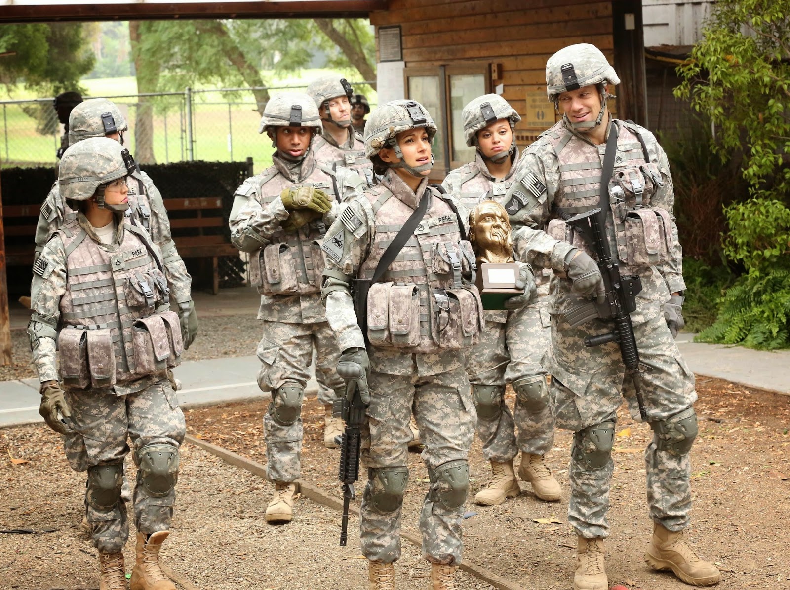 Bár a Pilotkritikában reméltem, hogy jobban megismerjük majd a mellékszereplőket, sajnos ez nem jött össze. Megtudtunk róluk egy-két információt, de túlzottan egyikükkel sem foglalkoztak. A mellékszereplők itt valóban mellékszereplők voltak, és csak nagyon ritkán kaptak lehetőséget a bizonyításra, ami tényleg sajnálatra méltó, mert a legtöbb nagyon jó volt. A kedvencem egyértelműen Robinson volt, a mexikói stílusával nagyon szókimondó volt. Az egyik részben, mikor megjelent a bundában, szakadtam a röhögéstől. A Robinson-Park-Jill trió pedig nagyon jó volt, több jelenetük is lehetett volna. Az első részt látva, azt hittem, hogy Pete és Jill tutira összejönnek, nos ez nem valósult meg, bár szerintem, ha a kapott volna folytatást a sorozat, előbb-utóbb összejöttek volna. Akit még mindenképpen meg szeretnék említeni, az a főtörzsőrmester, aki szokatlanul közvetlen volt a beosztottjaival, na meg eléggé komikus. De ez egy vígjátéksorozat, így nincs min csodálkozni. 🙂